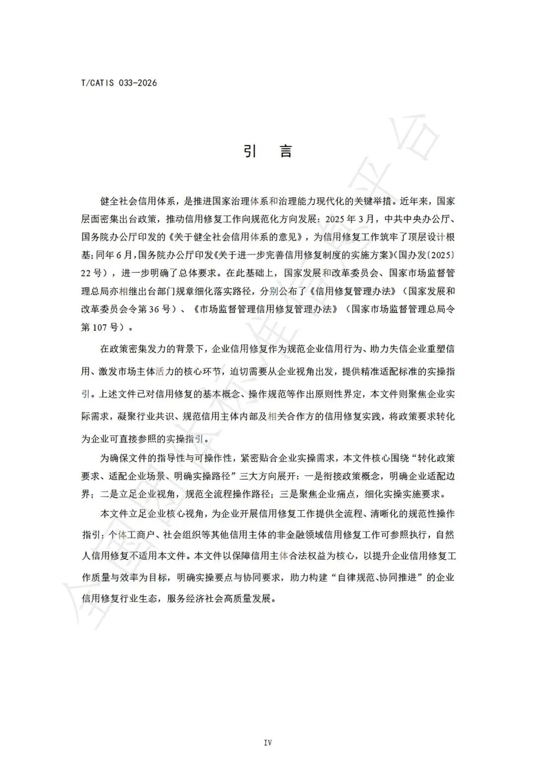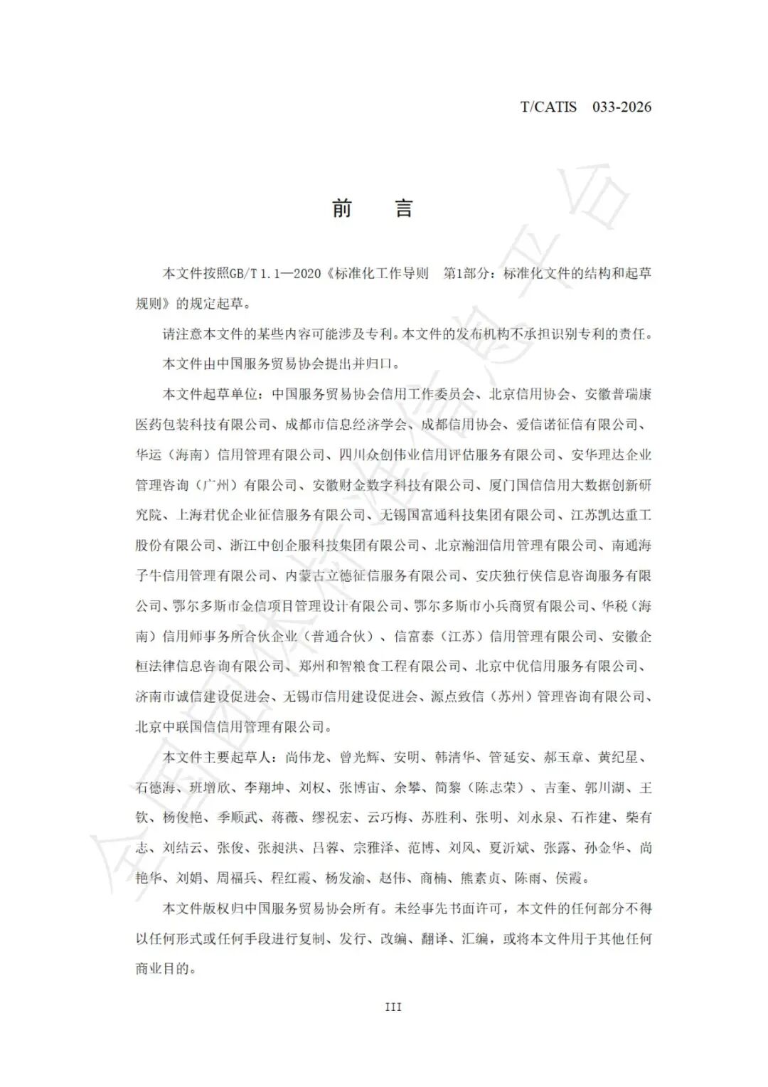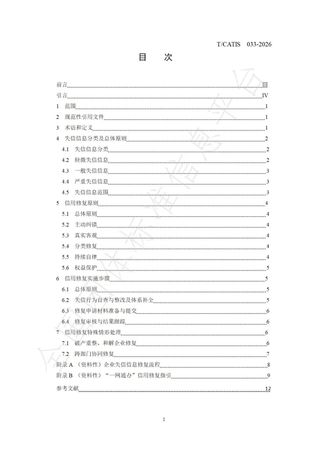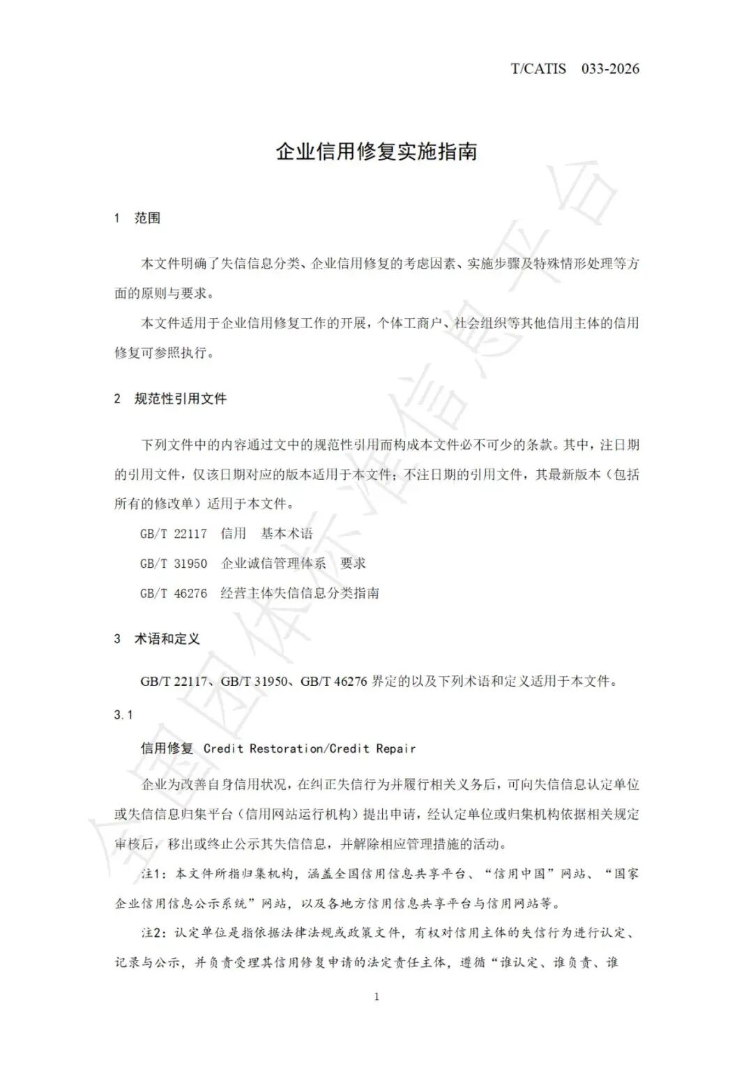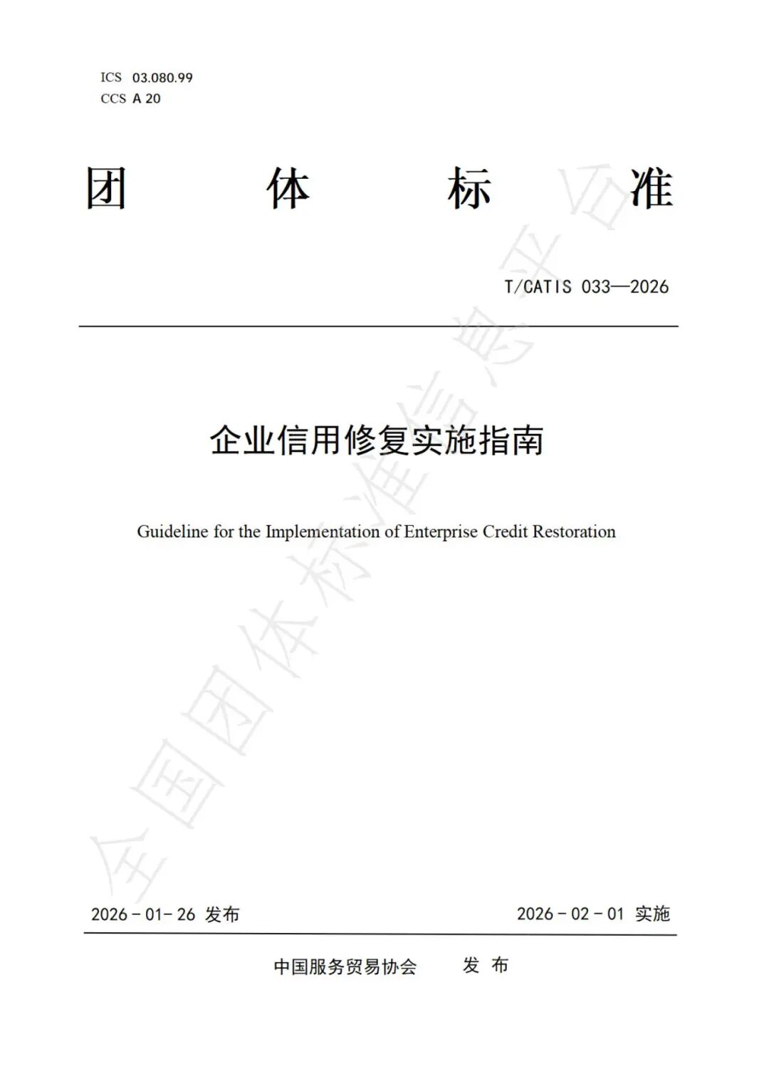 近日,中国服务贸易协会常务理事会依据《中国服务贸易协会团体标准管理办法》相关规定,发布了《企业信用修复实施指南》团体标准(标准编号:T/CATIS 033-2026),标准已于2026年2月1日起正式实施。