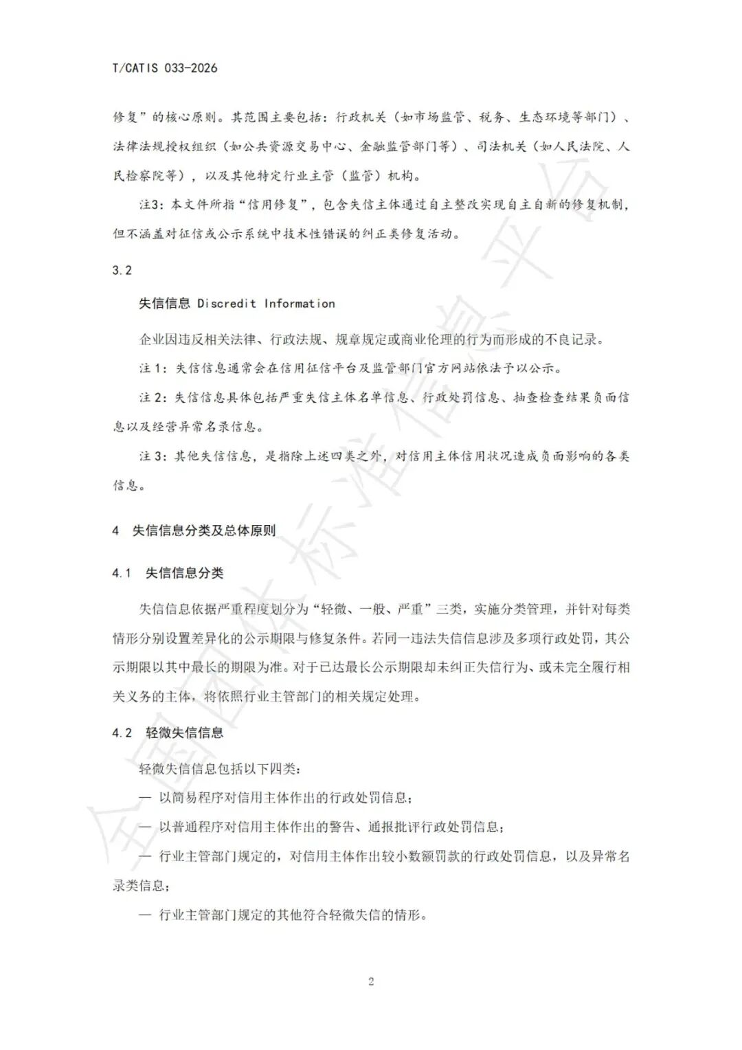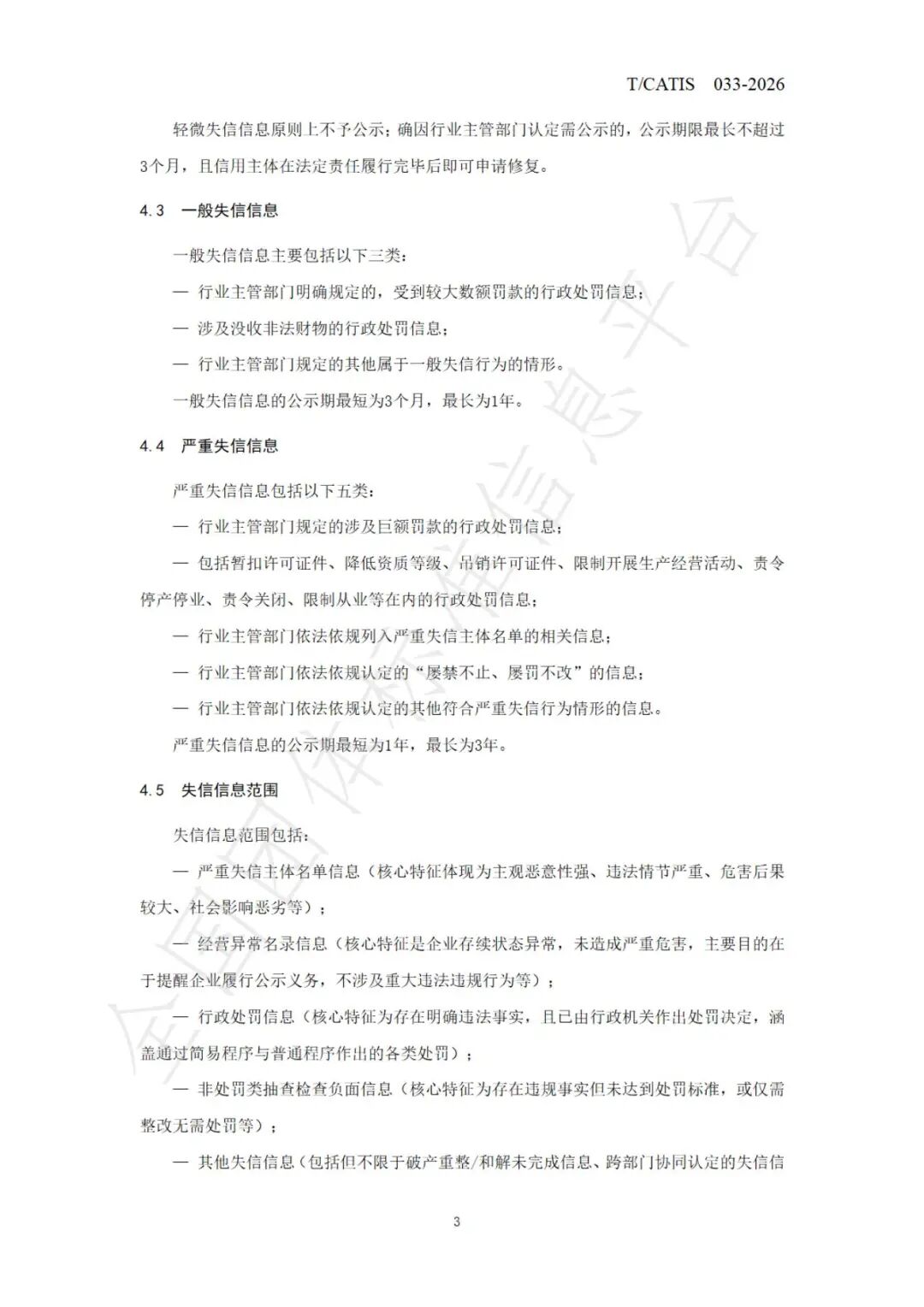 2、失信信息分类及总体原则:失信信息按照严重程度分为“轻微、一般、严重”三类,实行分类管理,分别设置不同的公示期和修复条件。